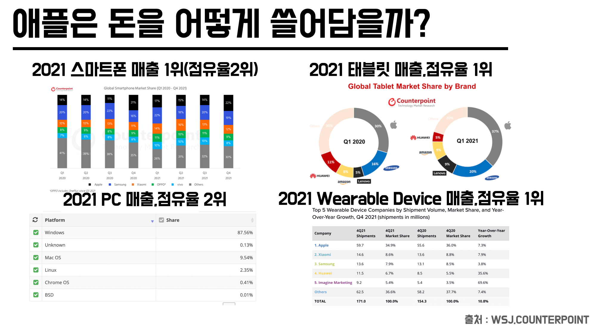 2021년 기준 아이폰의 매출 52.5% , iPad 8.7% , Mac 9.6% , Wearables 10.5% , Service 18.7%
