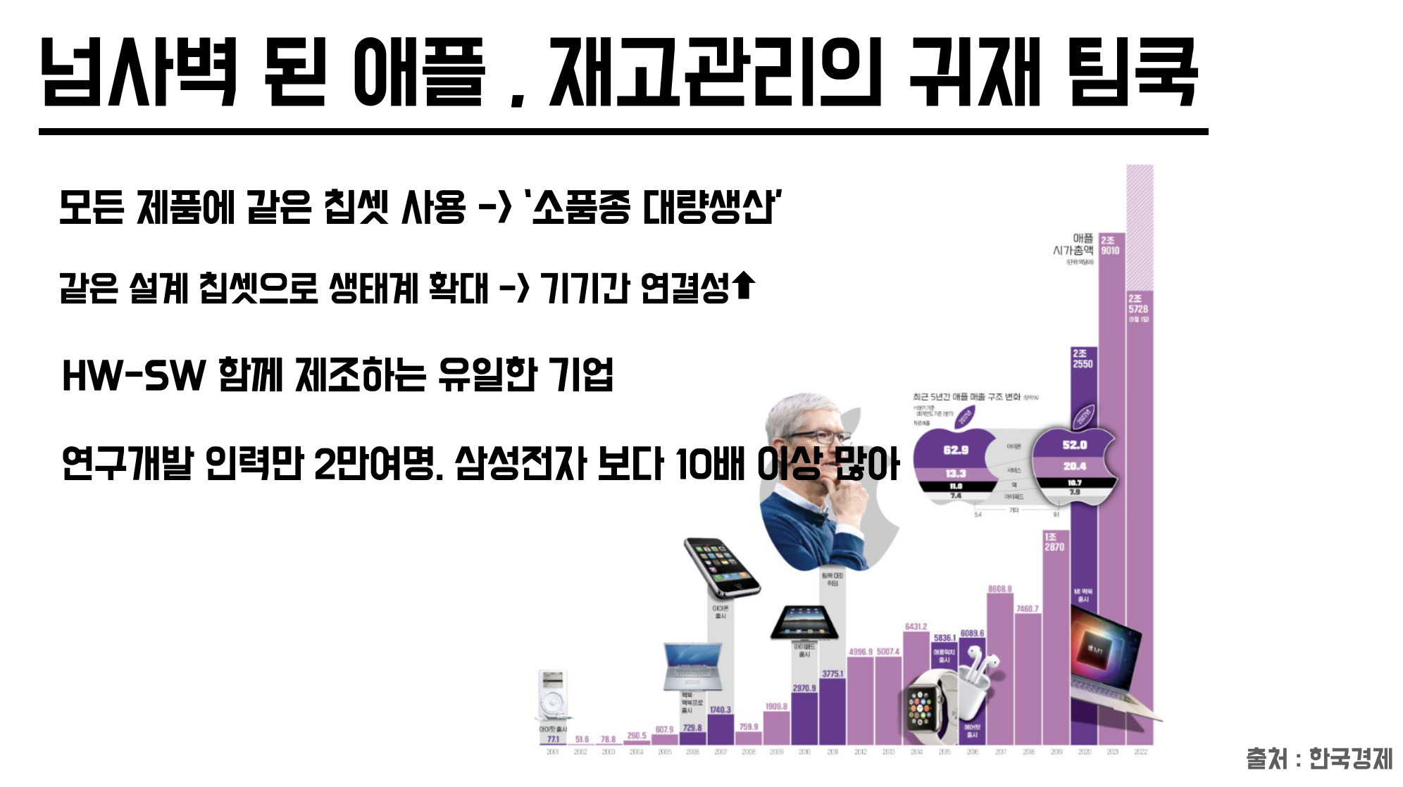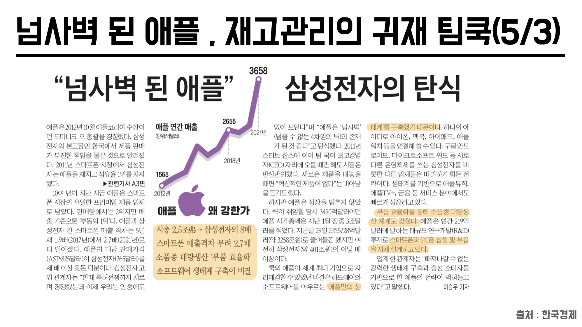 소품종 대량생산, 칩 자체 생산으로 인한 애플 생태계 확대. 아웃소싱으로 인한 재고 축소. 파운드리 TSMC와의 협력으로 빈도체 재고 확보