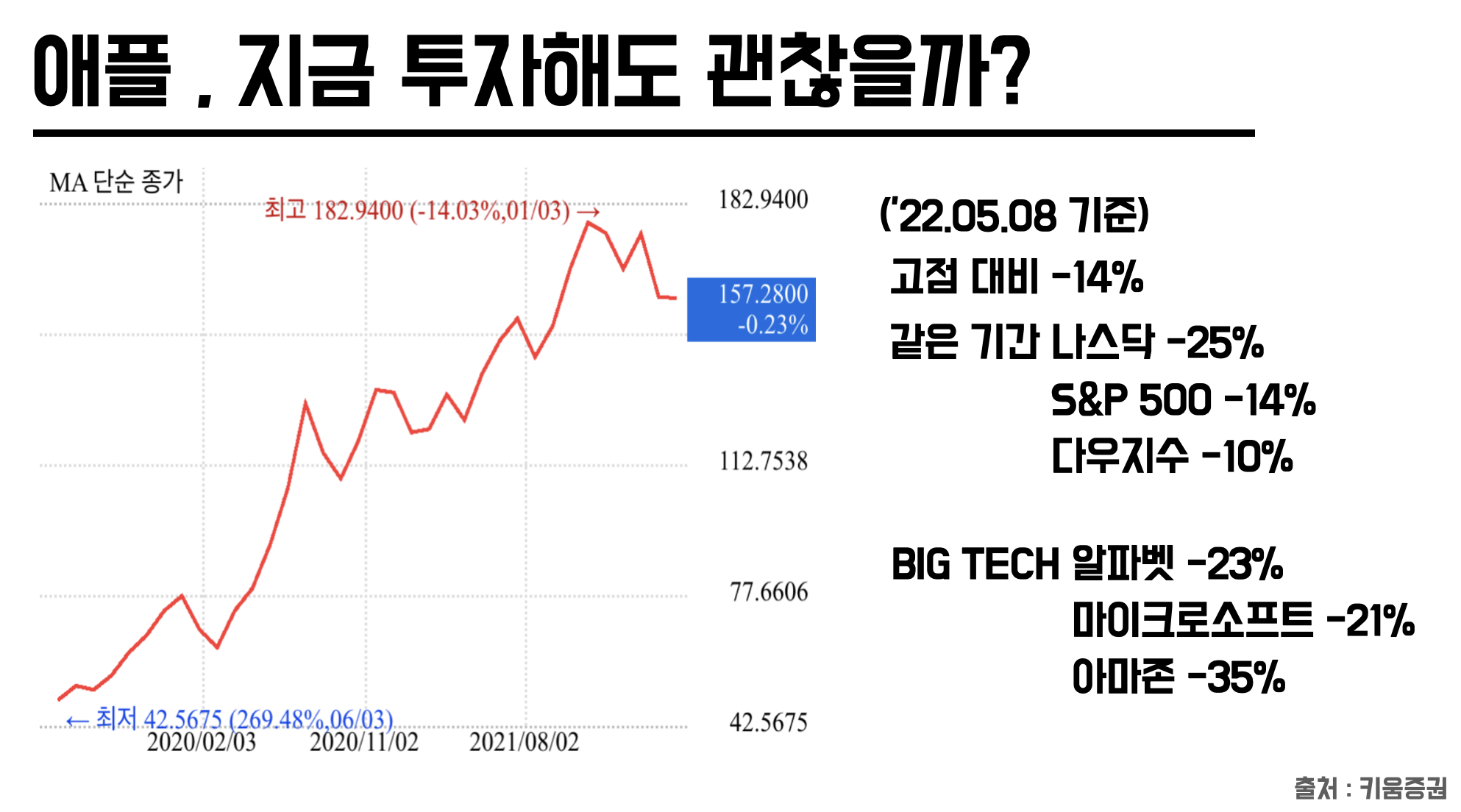 5/8(일) 기준으로 고점 대비 -14% 하락했다. 주요 지수 및 다른 BIG TECH 기업과 비교하면 나름 선방한 것으로 보인다. 어떻게 선방할 수 있었을까?