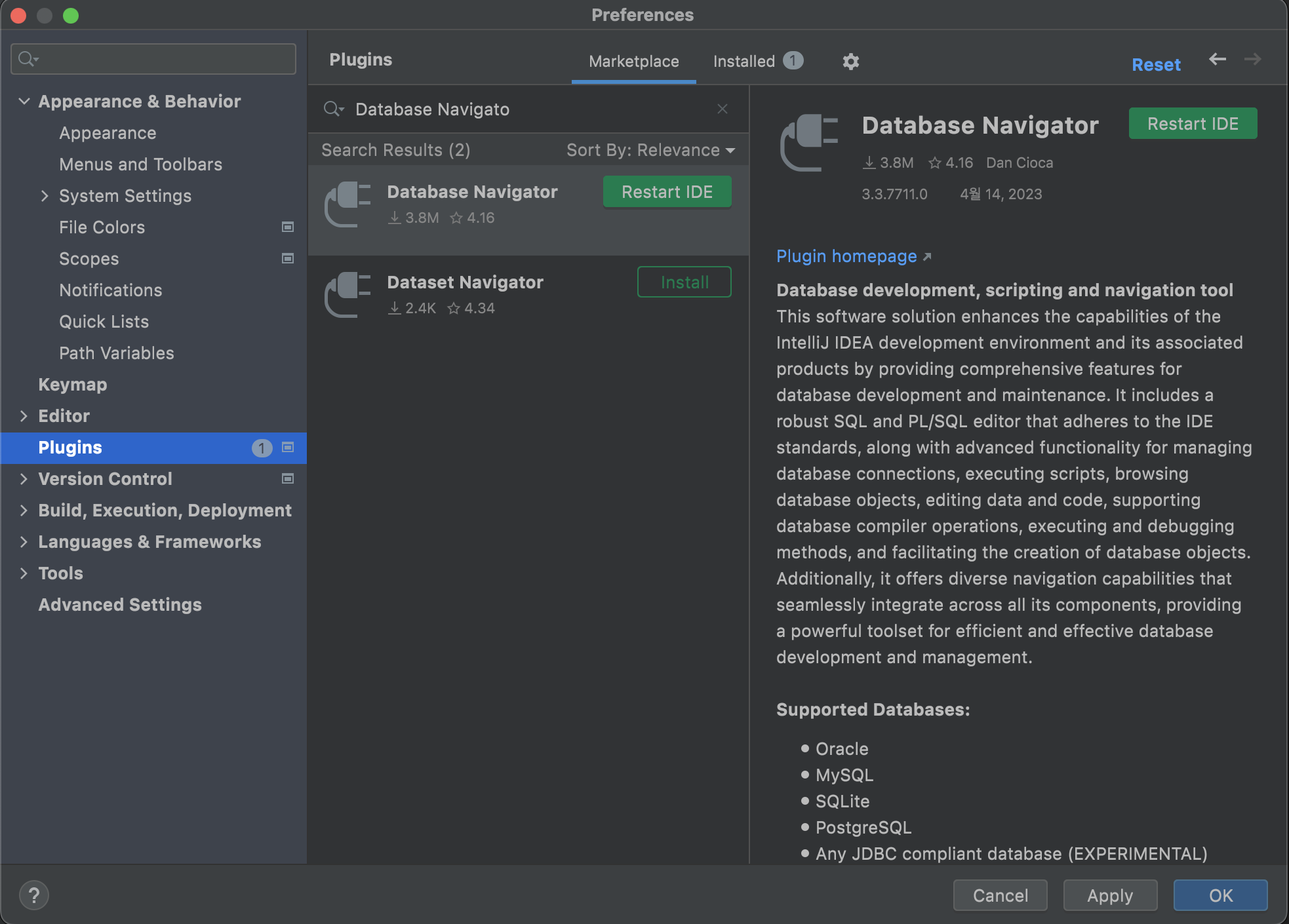Preference(Setting) -> Plugin 에서 "Database Navigator" 를 설치하고 IntellJ를 다시 켜주면 끝..!