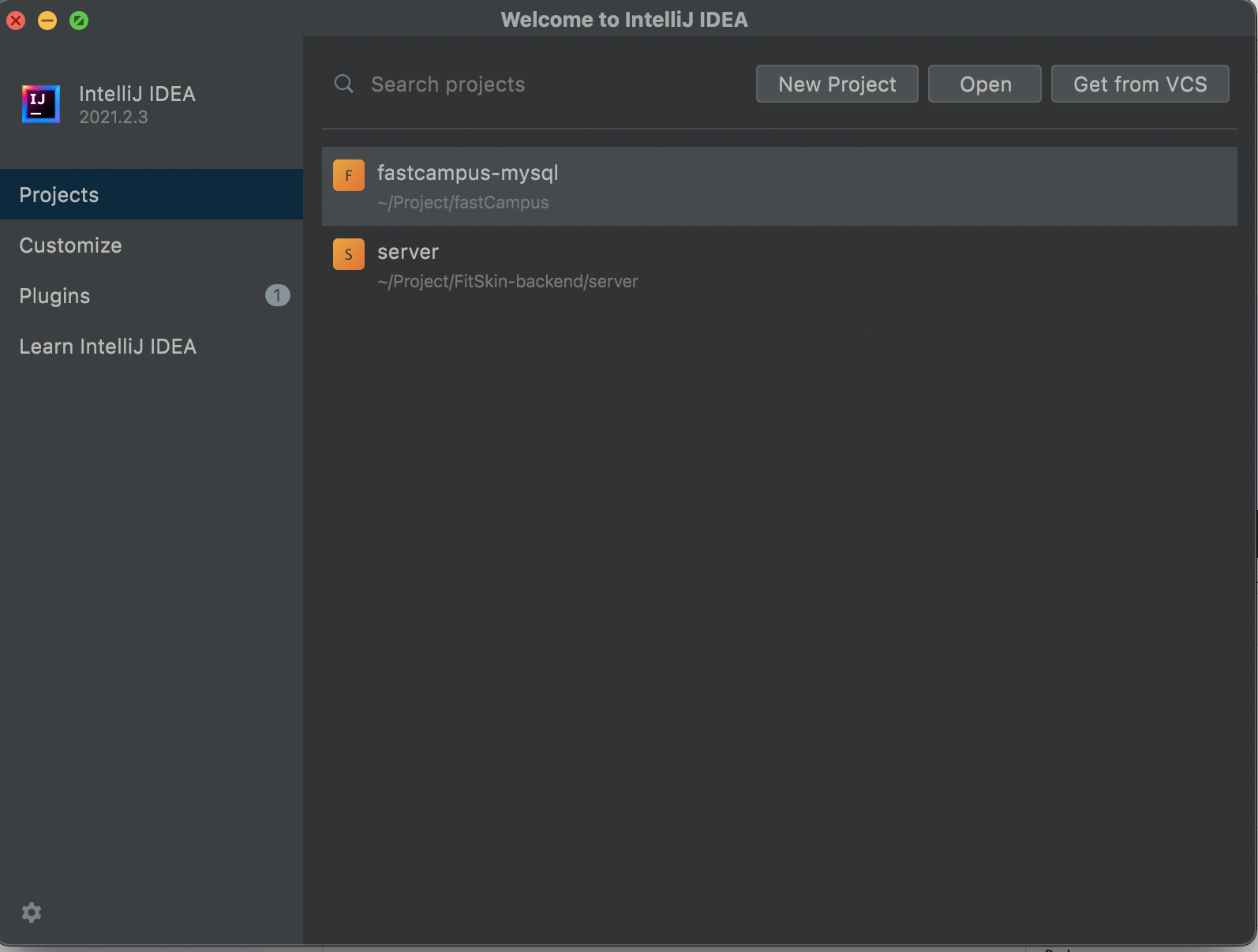 오른쪽 상단 "Get from VCS" 실행 후 아래 Git repository url 입력
