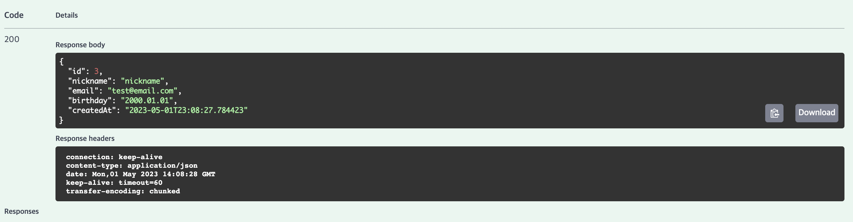 자 이제 준비는 끝났구 서버를 실행한 뒤 Swagger에서 직접 실행해볼게요. 실행하면 아래와 같이 데이터가 정상적으로 return되는걸 확인하실 수 있고