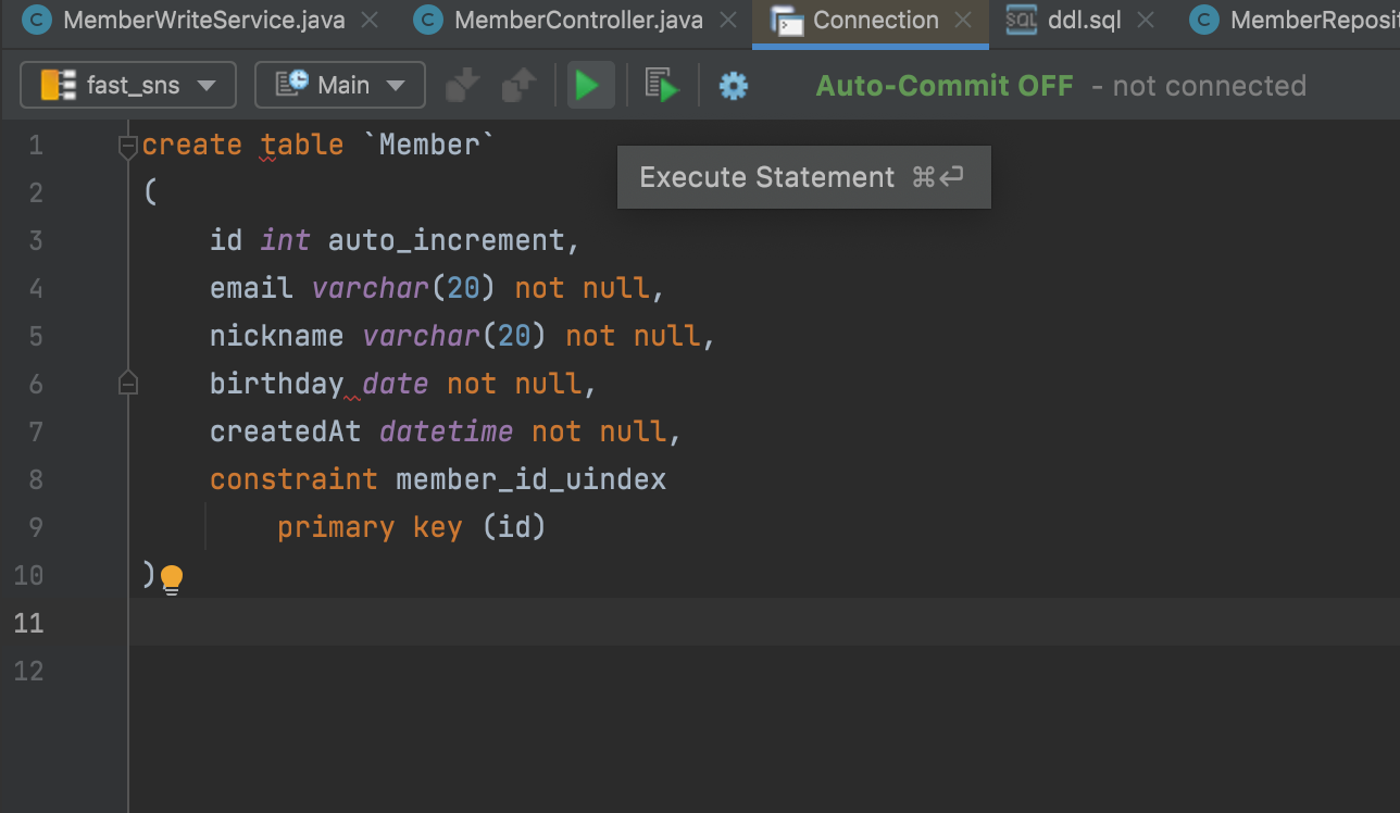 이제 직접 실행을 해봐야하는데 그 전에 DB에 Table을 생성해야 됩니다. JPA를 사용하면 자동으로 생성되지만 이번에 직접 한번 해볼게요!