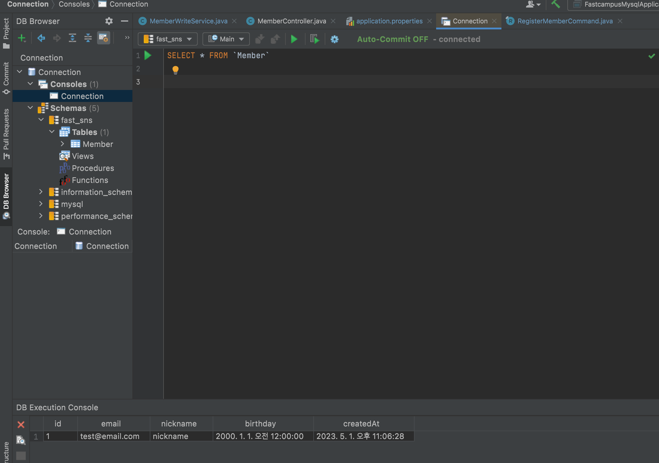 앞서 정의한 DTO인 RegisterMemberCommand를 통해 데이터를 받고 이를 Member Entity로 변환해요. 그리고 Repository에 전달하여 DB에 Insert하는 과정을 거치면 모든 비즈니스 로직이 끝나게 됩니다.
