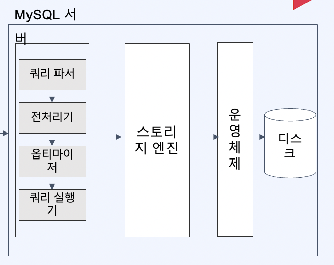 MySQL엔진은 쿼리 파서, 전처리기, 옵티마이저 , 쿼리 실행기로 구성되어 있어요
