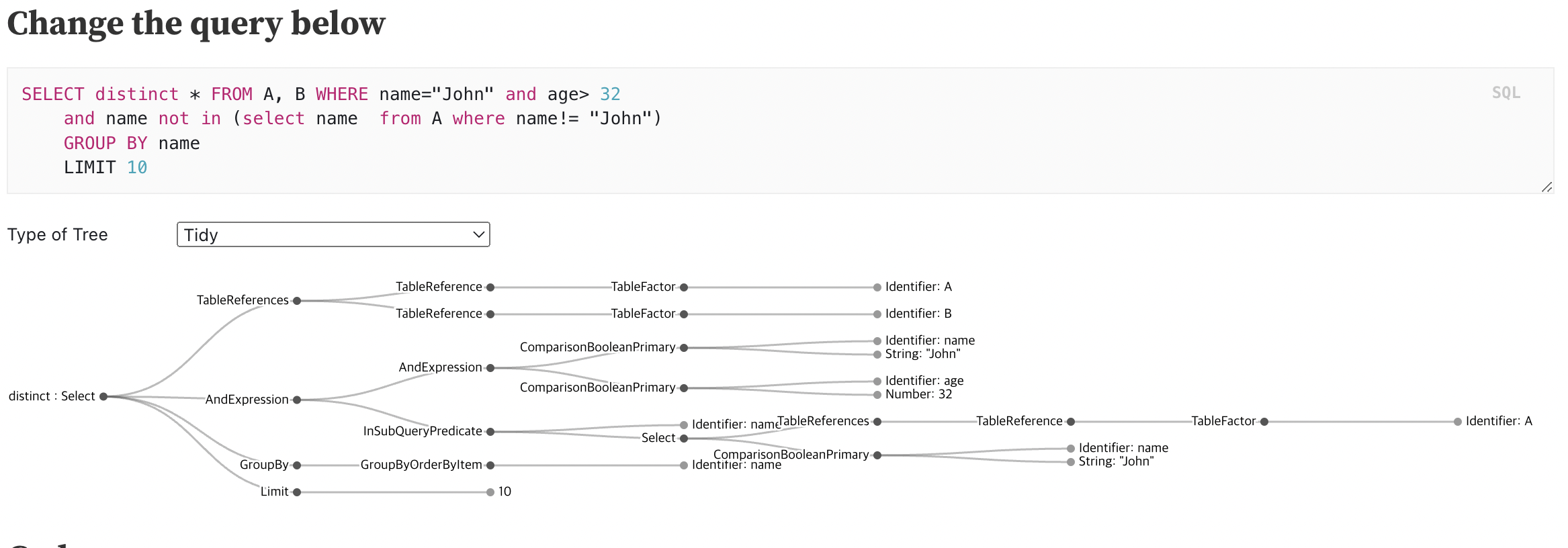 SQL Query Visualizer라는 서비스에서 Query를 입력하면 이를 어떻게 Syntax Tree로 변환되는지 확인할 수 있어요