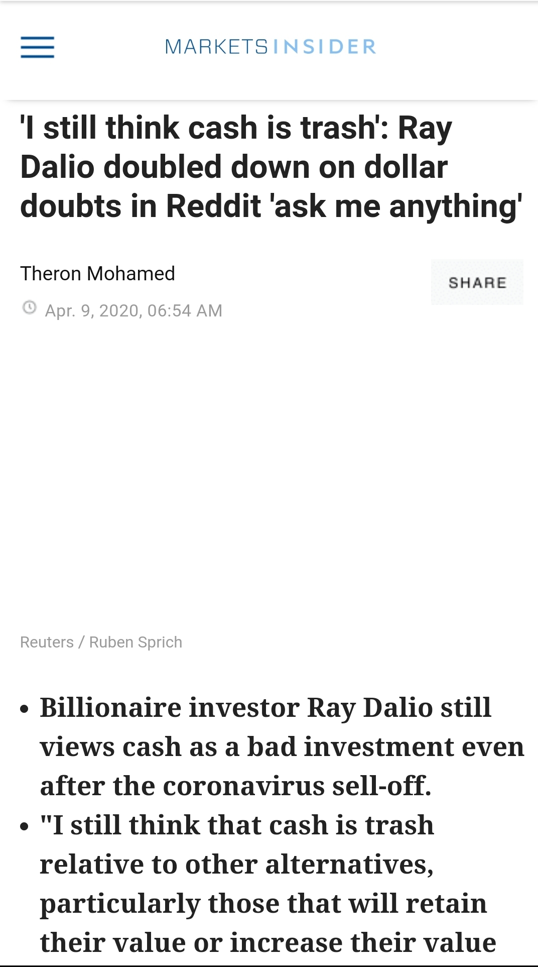 달러는 "쓰레기"며 이번 코로나 사태 중에는 유동성 수요로 괜찮지만 이 위기가 지나면 가치가 떨어질 것이다 라고 얘기했다.
