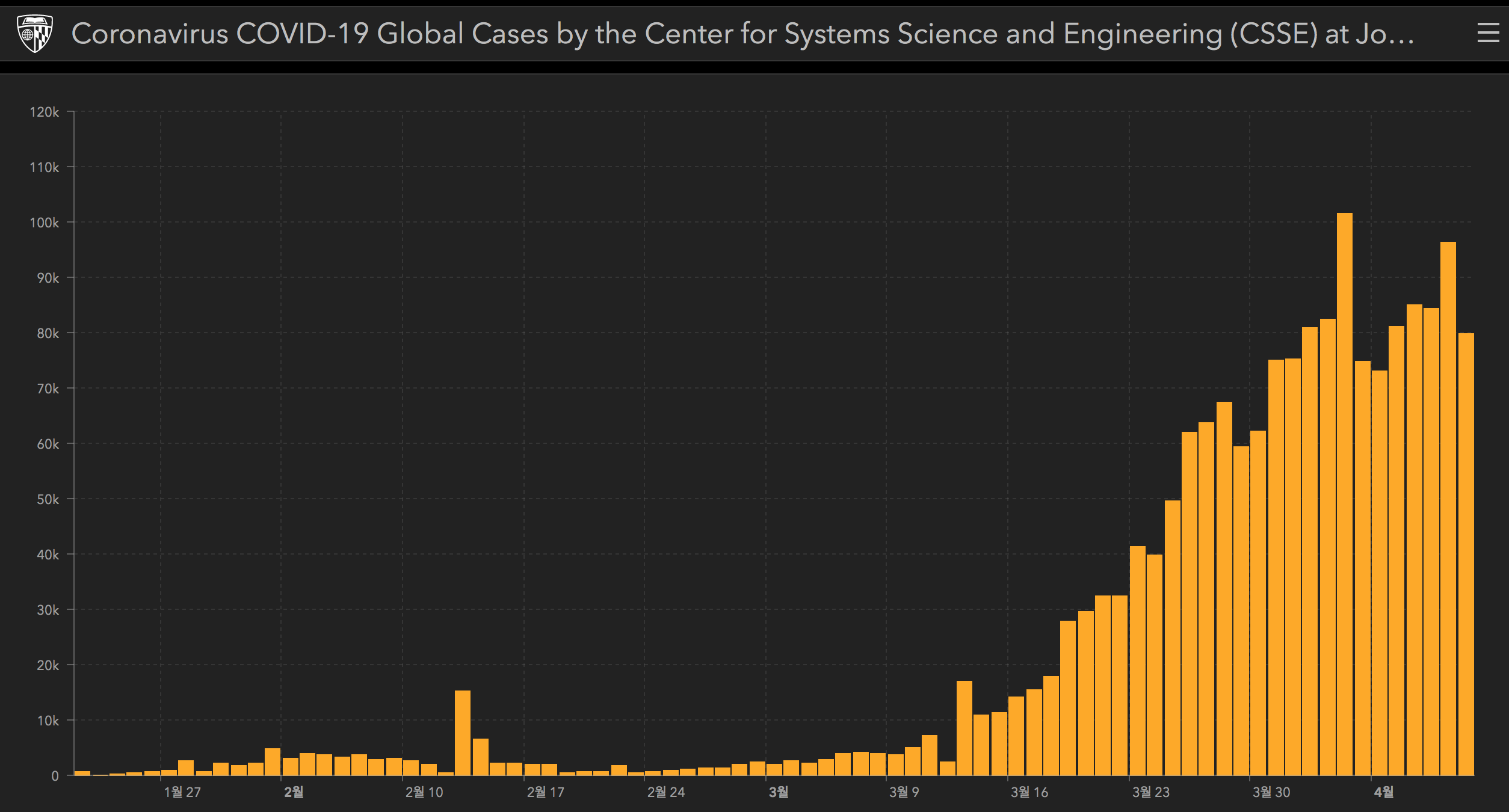 모든 유럽국가가 이탈리아처럼 감소 추세는 아니다. 스페인,독일,프랑스는 감소추세이지만 영국, 네덜란드는 이제 시작인 것처럼 확진자 수가 많다. 위 통계 데이터는 존스홉킨스 코로나 공식 홈페이지에서 실시간으로 확인할 수 있다.