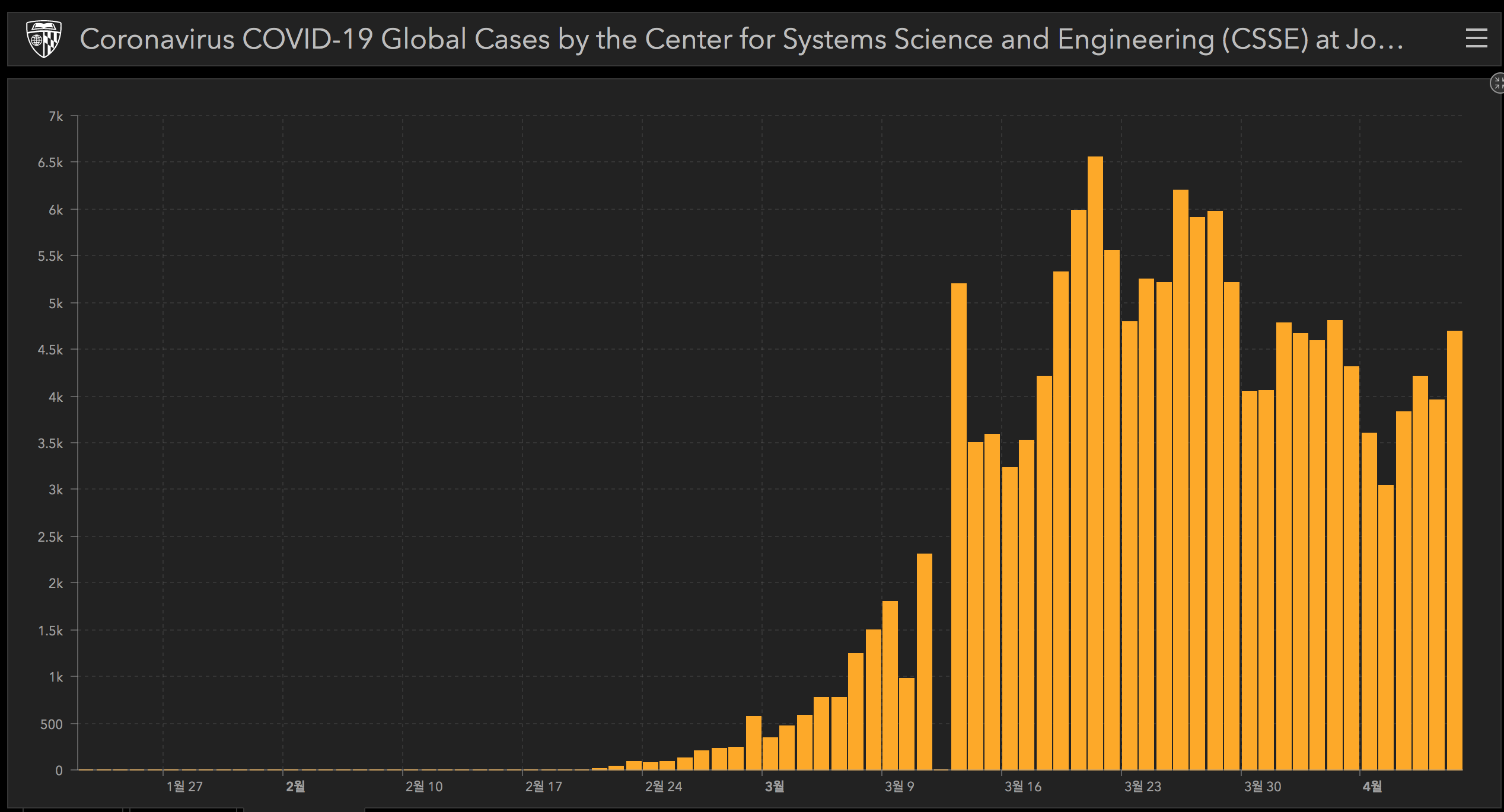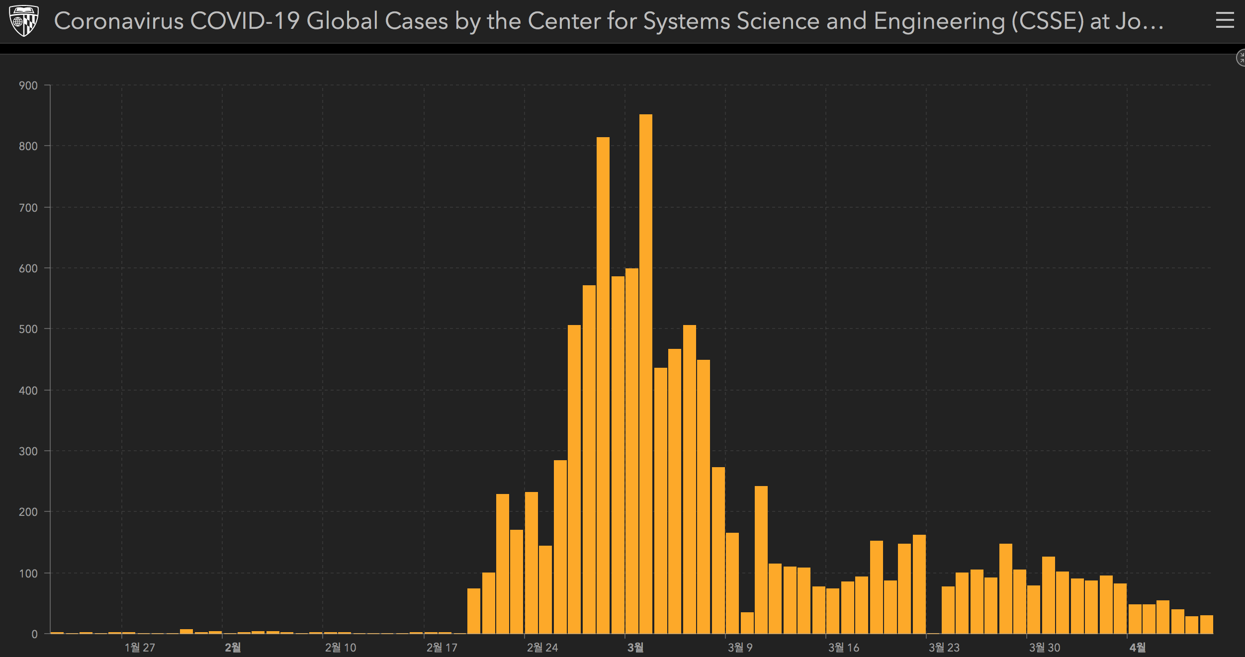 4월 4일 최고치를 찍은 후, 확진자수가 증가하지 않고 유지되고 있지만 그래도 아직 감소되고 있는것 같지는 않다.