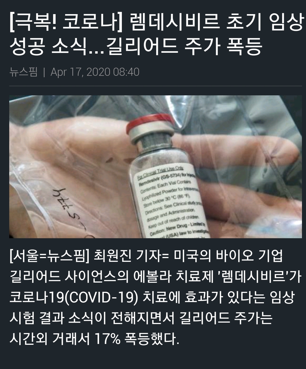 기쁜 소식은 코로나 치료제 관련 임상결과가 좋게 나왔다고 한다.
