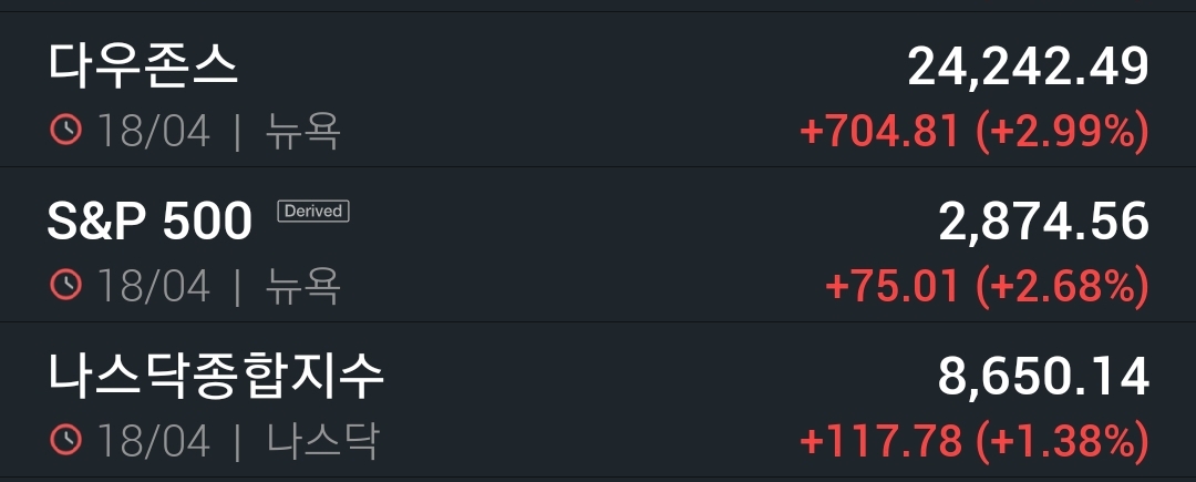 4월 1일 다우지수 21000대에서 시작하여 약 3000포인트가 올랐다. S&P는 400포인트, 나스닥은 1000포인트 이상 상승했다.