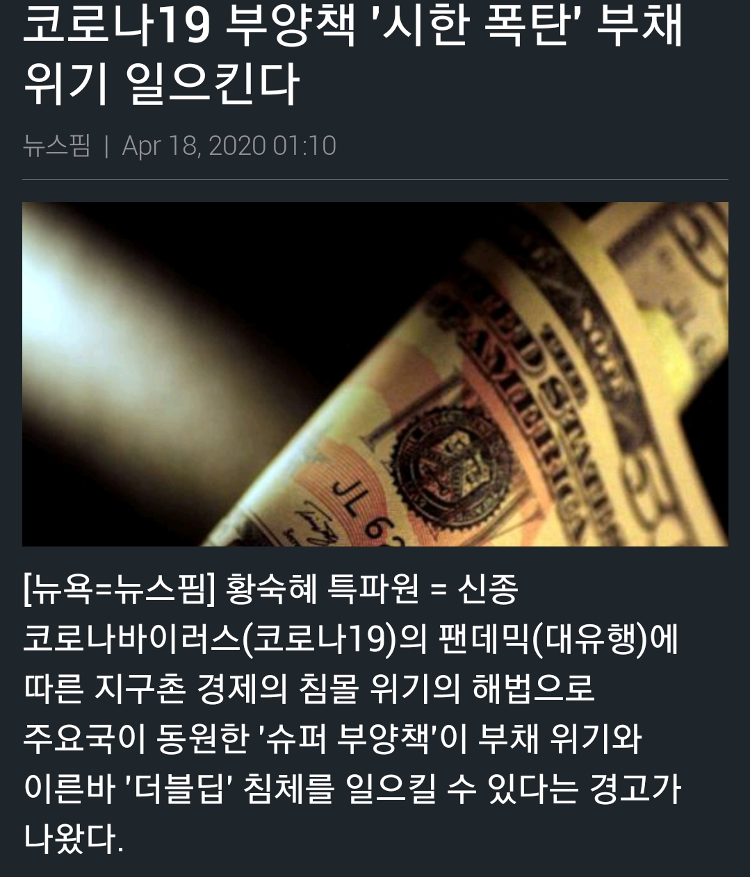 대규모 부양책으로 전세계 부채가 어마어마하게 증가하여 이를 버티기 힘들것이란 얘기다.