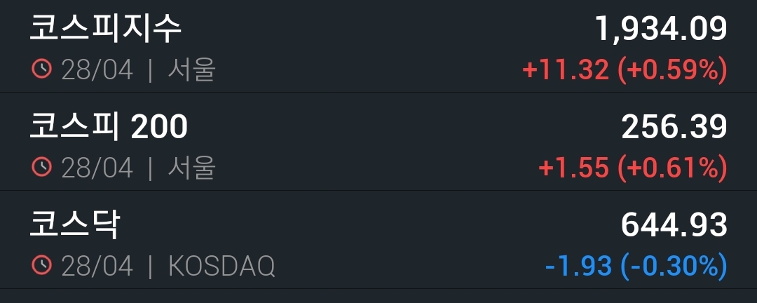 코스피는 약간 상승했으며 코스닥 및 미주요증시는 하락했다.