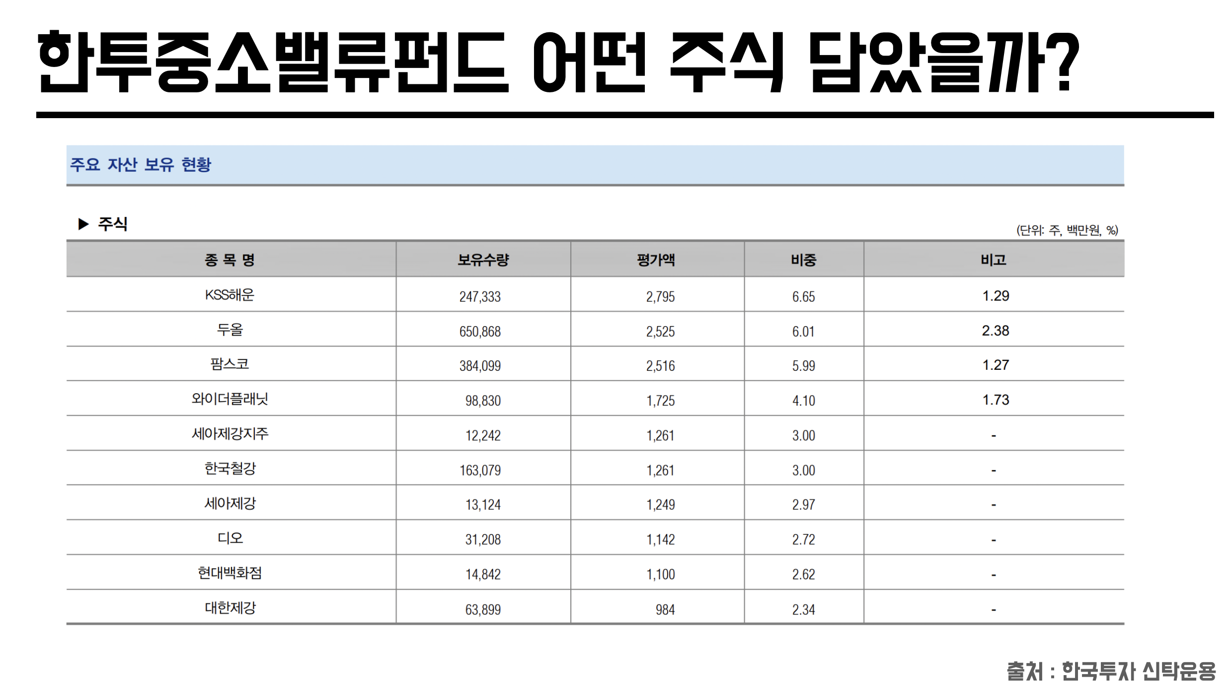 그럼 위와 같은 관점의 결과로, 한투중소밸류펀드가 담은 종목은 어떤게 있을까?