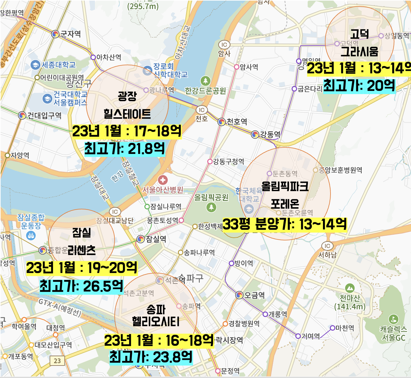 인근 지역인 송파구, 강동구, 광진구 대장아파트의 최고가와 23년 1월 실거래가를 비교해봤습니다.