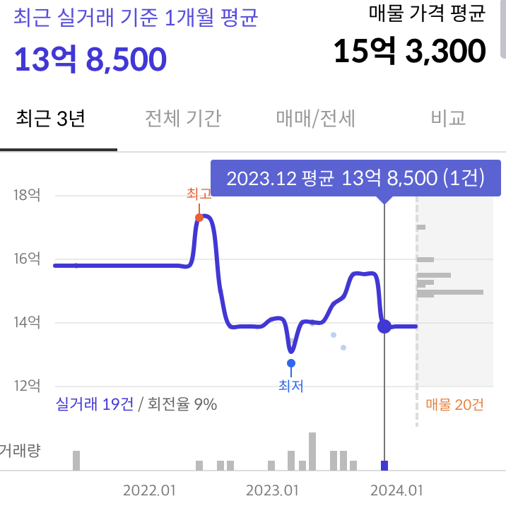 가장 최근 실거래로는 13.85억에 거래되고 있습니다. 고점 대비 20%정도 하락했습니다.