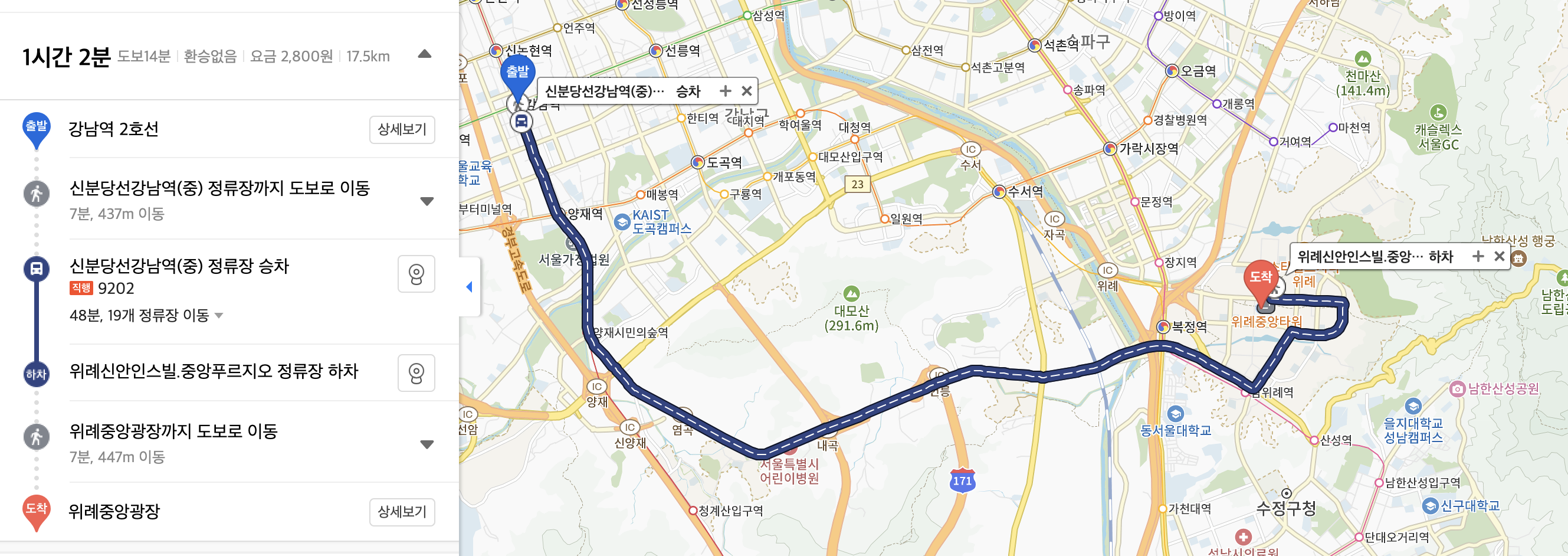 빨간버스도 서울에서 접근할 수 있는 방법이 있긴하지만 꽤 돌아가는 편이라 편도 1시간이상은 잡아야해요.