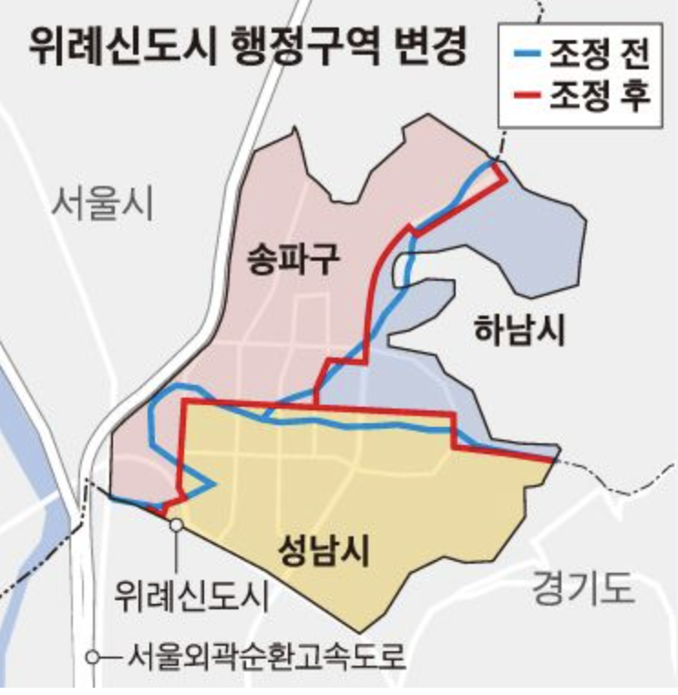 "서울 송파구 + 경기도 성남시 + 경기도 하남시 => 위례"로 구성되어 있어요.