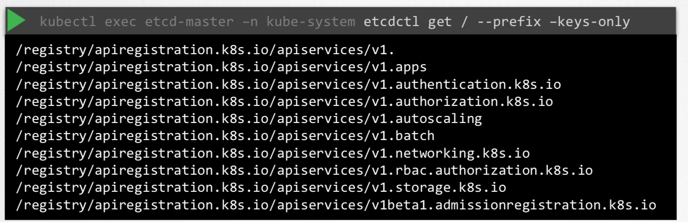 kubectl exec etcd-master –n kube-system etcdctl get / --prefix –keys-only