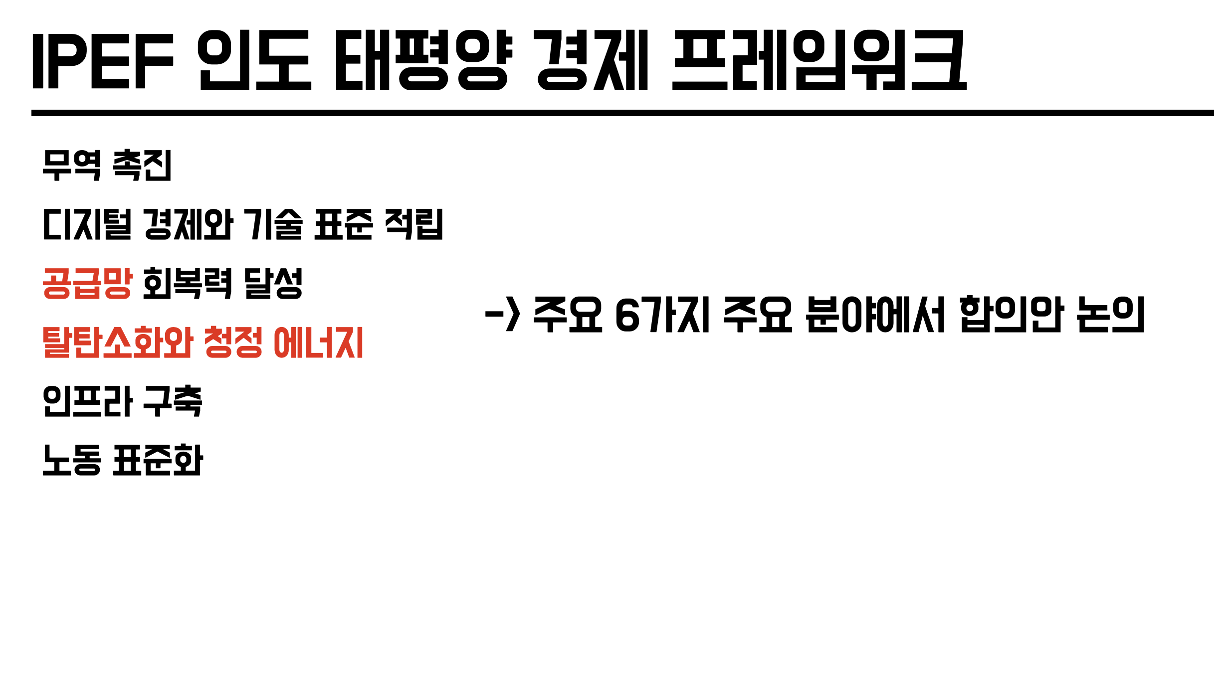 IPEF는 표면적으로는 위 6가지 분야에 대해 함께 합의안을 도출하는 것이지만 , 이면적으로는 중국에 대한 경제 압박이라고 볼 수 있다