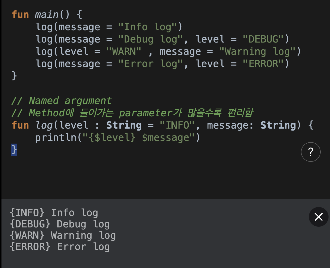 log(message = "Info log") // level 값이 없을 경우 함수의 Default 값을 사용