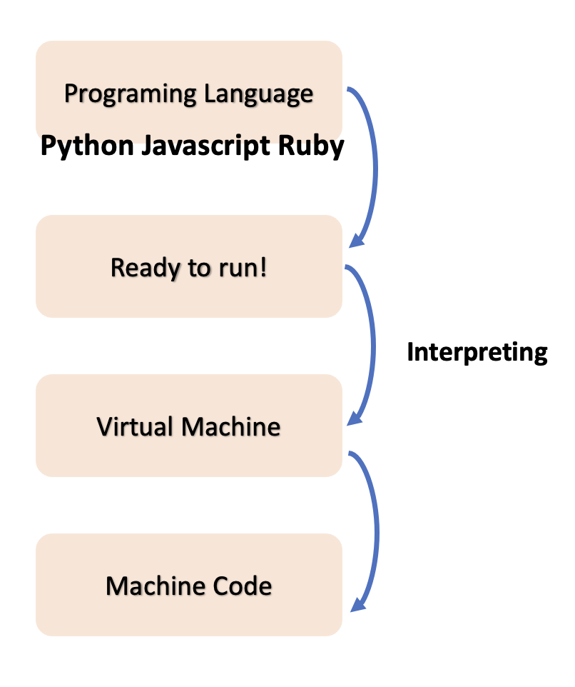 Interpretation은 Interpreter가 이를 모두 대신 해줍니다. 운영체제에 맞게 알아서 해석해주는거라 개발자는 편합니다.