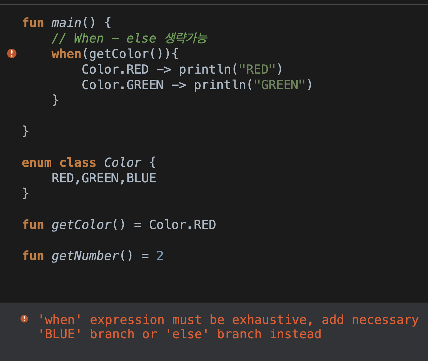 대신 enum에 다른 값이 추가되어있는데 when에 case가 없거나 else문이 없다면? 이 역시 컴파일 에러가 발생합니다.