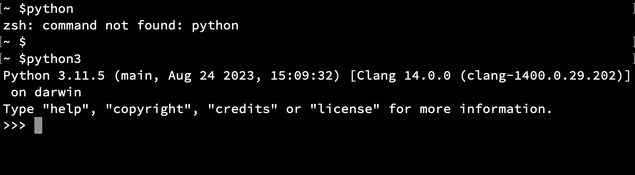 Python이라는 명령어 대신 "Python3" 라는 명령어를 입력해야 합니다.