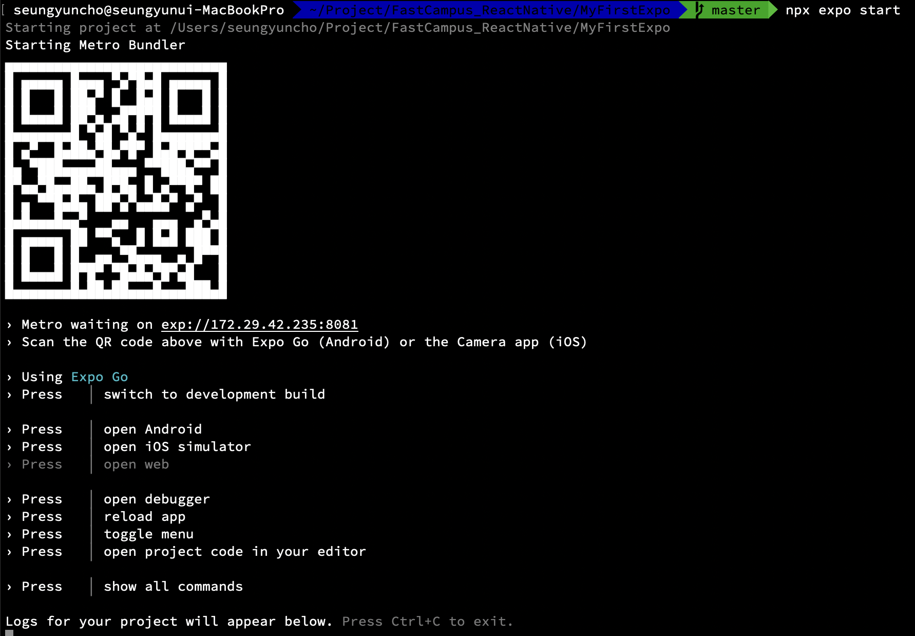 근데 expo가 설치되어 있지않다면 그 전에 "brew install expo" 와 같이 설치를 먼저 해야 될거에요.