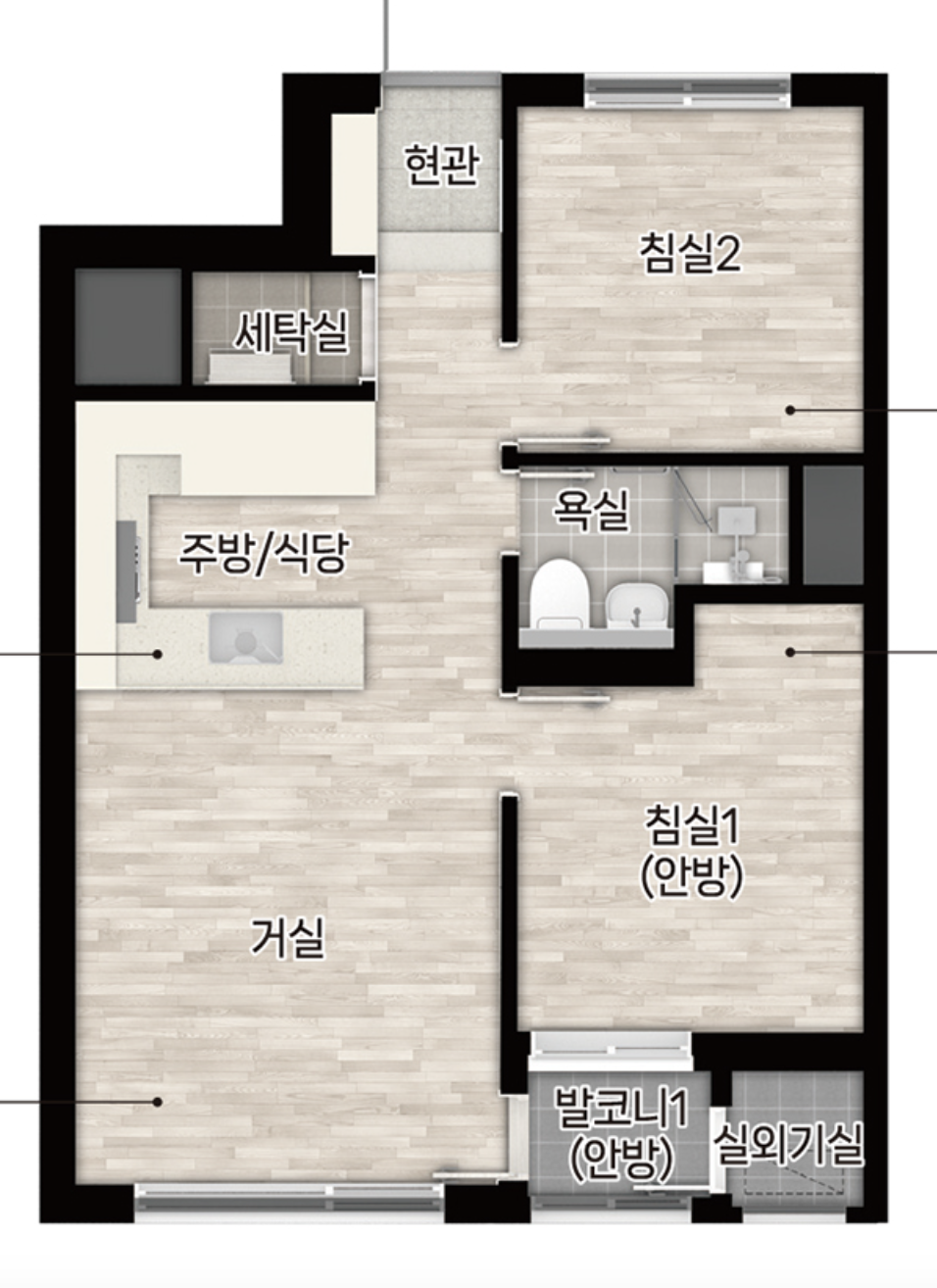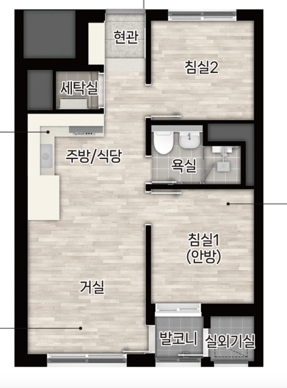49제곱의 경우 다른 신축아파트는 방3개 화장실 2개인 경우도 있었는데, 이 단지는 아쉽게도 두 평면도 모두 거실 1개, 방2개, 화장실 1개의 아쉬운 평면이었어요.
