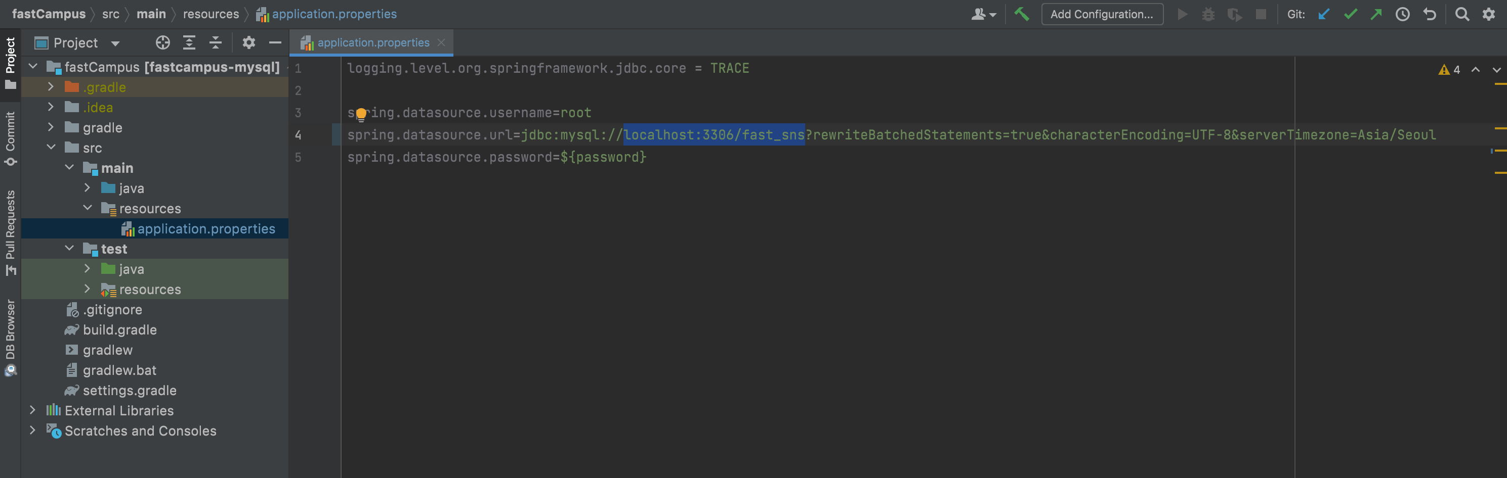 spring.datasource.url=jdbc:mysql://localhost:3306/fast_sns?rewriteBatchedStatements=true&characterEncoding=UTF-8&serverTimezone=Asia/Seoul
