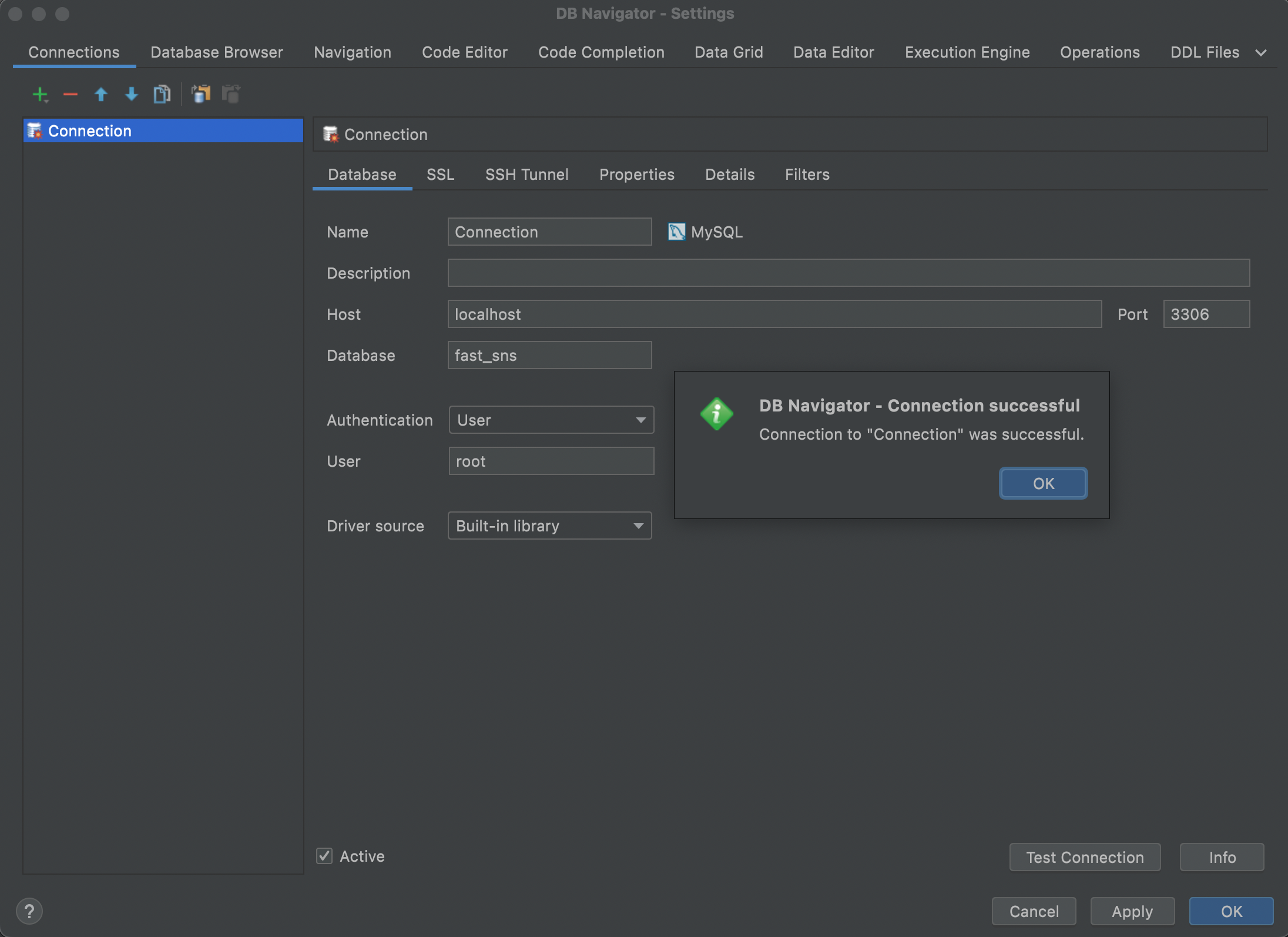 전 비밀번호는 따로 설정안해서 User만 입력했습니다. 입력하고 Test Connection 실행하면 아래와 같이 Successful 확인하면 됩니다. 그리고나서 OK까지 누르면 끝!