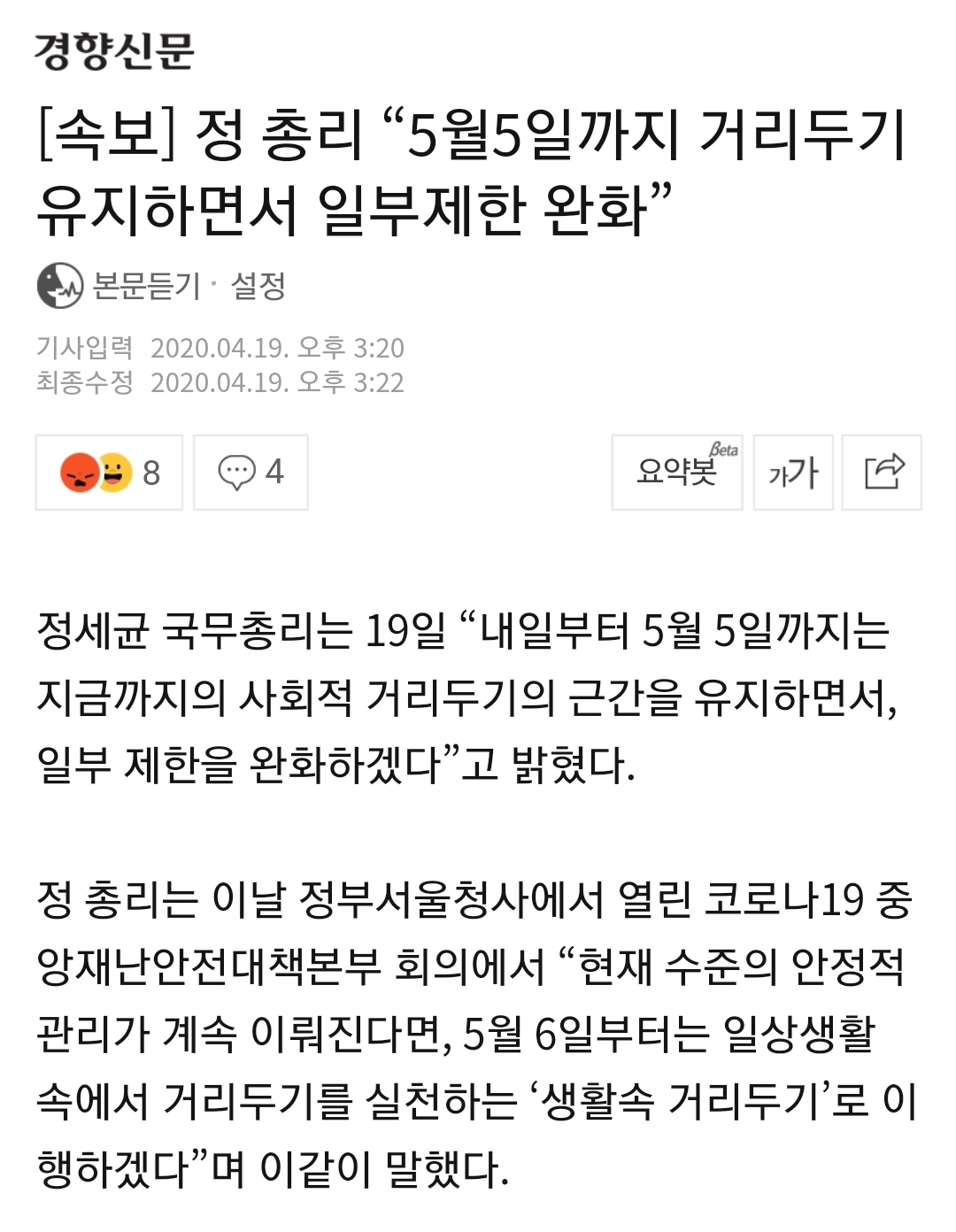 우리나라는 5월 5일까진 지금 상황 유지한 채, 6일부터 조금씩 완화한다고 한다.
