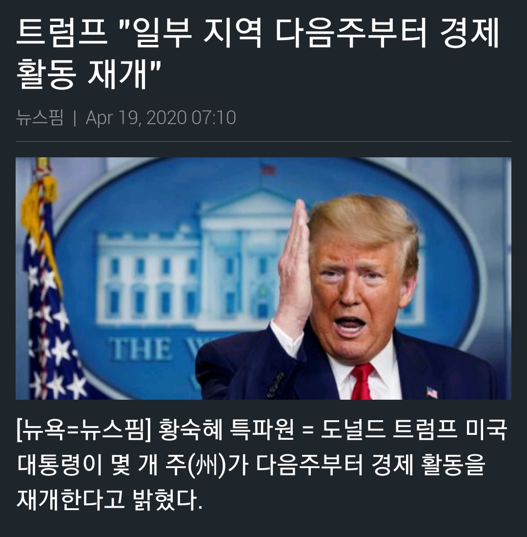 뉴욕을 포함한 몇몇 주정부는 아직 시기가 이르다고 말하지만 텍사스주부터 사회적 거리두기를 조금씩 완화한다는 태도를 트럼프는 취하고 있다.