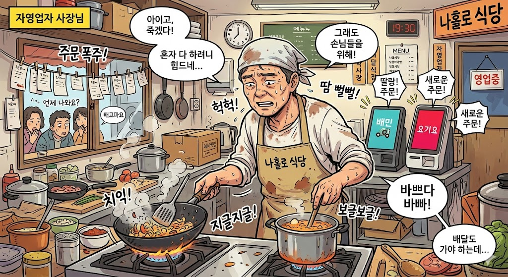 단순 업무를 도와주는 직원이 생겨서 사장님은 조금 편해졌지만, 그래도 음식 만드는게 여간 쉬운게 아닙니다.