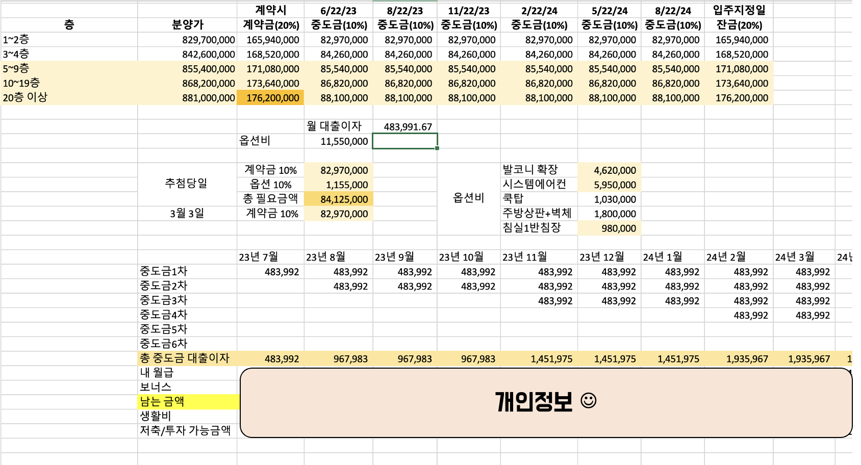 계약금 20%는 보유하고 있는 현금으로 납부하고, 중도금 대출이자가 나오는 시점부터 월급, 대출이자 , 생활비, 저축 가능한 금액을 입주시점까지 계산했어요. 이게 정말 자금마련 준비하는데 많은 도움이 되었습니다.
