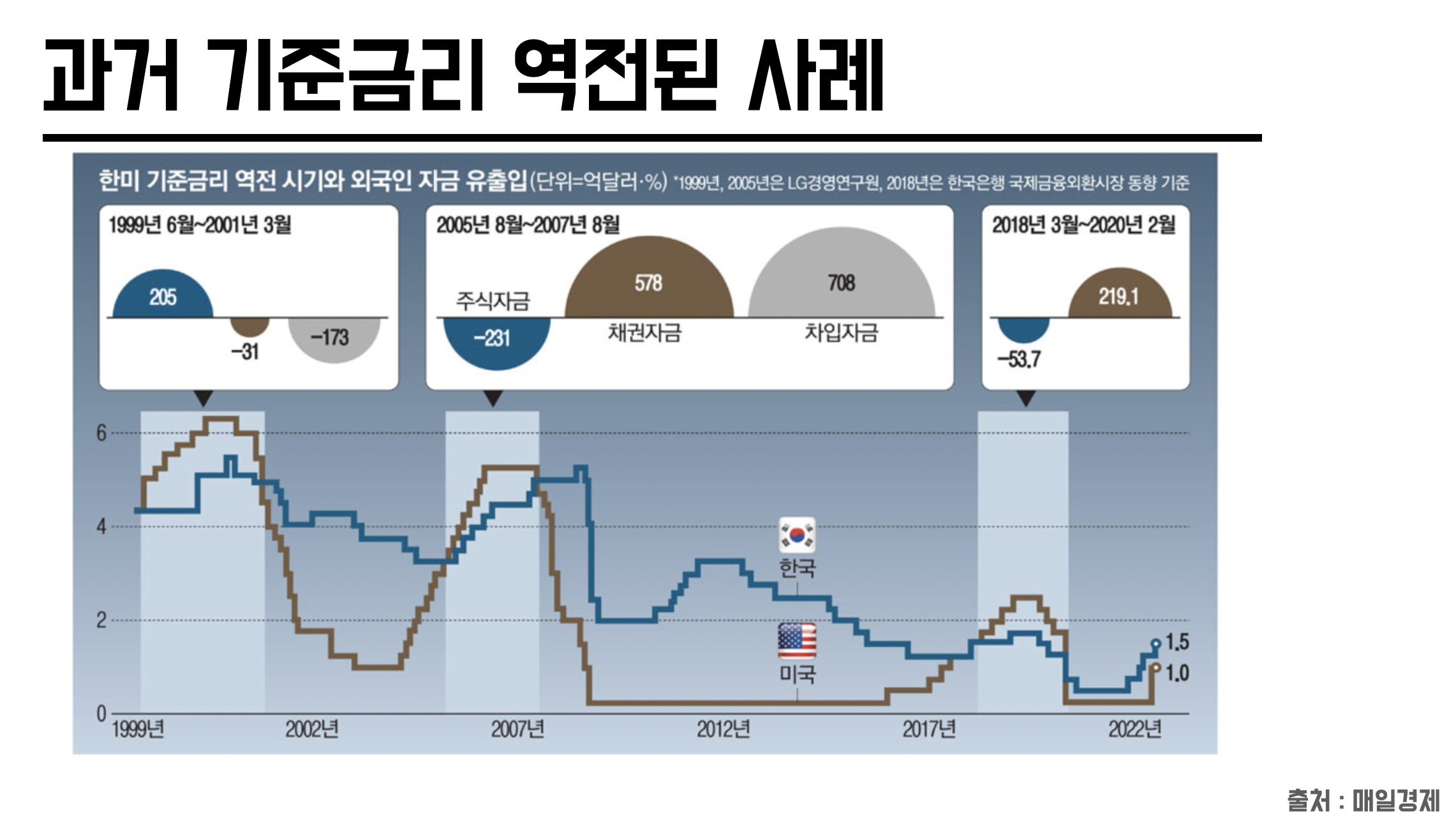 이에 따라 과거 사례와 똑같이 볼 수 없으며 , LG경영 연구권 관계자에 따른 "향후 한미 정책금리 역전 폭이 확대될 가능성이 높은 상황에서 원화 약세 전망이 고조될 경우 , 외국인 자금 이탈 가속 , 주가 하락 , 시중금리 상승, 원화 가치 하락등의 충격이 나타날 수 있다"고 지적했다.