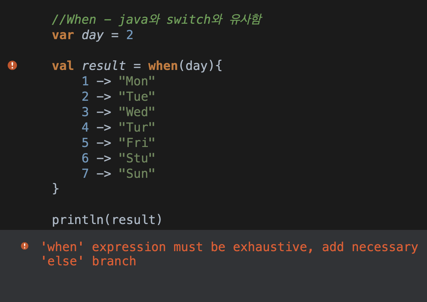 when구문에서 이에 대한 처리를 하지 않았다면 아래와 같이 컴파일 에러가 발생하는 것을 보실 수 있습니다.